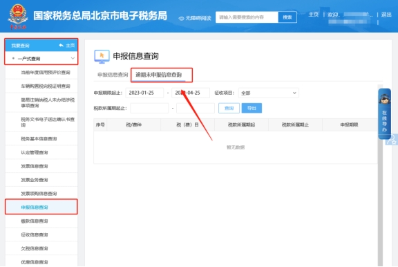 (1)請(qǐng)您選擇【我要查詢(xún)】—【一戶(hù)式查詢(xún)】—【申報(bào)信息查詢(xún)】—【逾期未申報(bào)信息查詢(xún)】調(diào)整查詢(xún)條件查看;