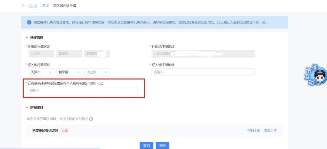 系統(tǒng)初始化功能界面,預(yù)填遷出地信息,手動補錄遷入地省級(計劃單列市級)、市級、區(qū)級行政區(qū)劃以及遷入地注冊地址、遷入地街道、遷移前尚未彌補的經(jīng)營所得個人所得稅累計虧損(元)等數(shù)據(jù)項信息,并上傳已變更的外省市營業(yè)執(zhí)照,點擊【預(yù)檢】。