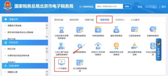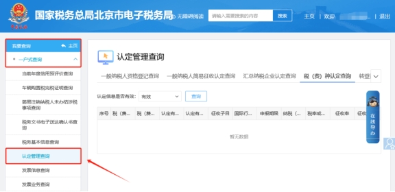 (2)請您點(diǎn)擊【我要查詢】—【一戶式查詢】—【認(rèn)定管理查詢】—【稅(費(fèi))種認(rèn)定查詢】,查詢條件選成全部查詢。