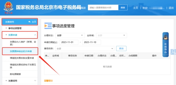 二、發(fā)票使用—發(fā)票申請—發(fā)票票種核定初次申請,進(jìn)入票種申請模塊,在填寫并提交相關(guān)資料后,等待票種核定完成。