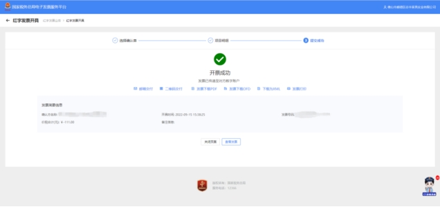 3.點(diǎn)擊頁(yè)面下方的“開具發(fā)票”,提示紅字發(fā)票開具成功。