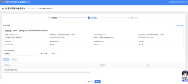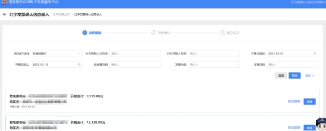 3.查詢到需要紅沖的藍(lán)字發(fā)票后,點(diǎn)擊右側(cè)對(duì)應(yīng)的“選擇”按鈕,進(jìn)入“②信息確認(rèn)”頁(yè)面,需要沖紅的藍(lán)字發(fā)票信息會(huì)自動(dòng)帶入。