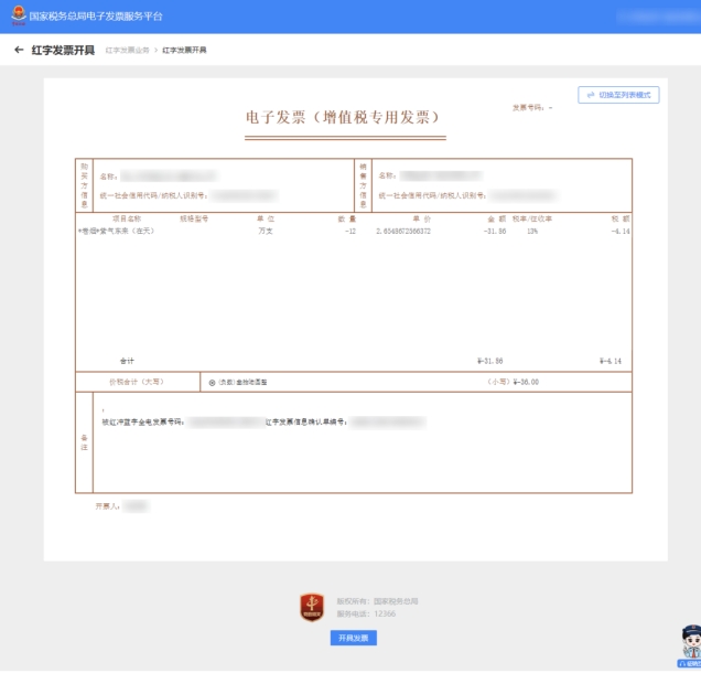 2.點(diǎn)擊【去開票】,進(jìn)入紅字發(fā)票開具頁(yè)面核對(duì)發(fā)票信息,也可切換到票面模式預(yù)覽。