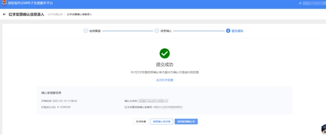 4.點(diǎn)擊頁(yè)面下方的“提交”按鈕,跳轉(zhuǎn)到“③提交成功”界面,提示紅字發(fā)票信息確認(rèn)單提交成功。若銷方開具藍(lán)字發(fā)票后,藍(lán)字?jǐn)?shù)電票的“增值稅用途標(biāo)簽”為空、“消費(fèi)稅用途標(biāo)簽”為“未勾選庫(kù)存”、“入賬狀態(tài)標(biāo)簽”為“未入賬”或“已入賬撤銷”的,由銷售方單獨(dú)發(fā)起紅沖,不需對(duì)方確認(rèn),在完成“紅字發(fā)票確認(rèn)信息錄入”后,點(diǎn)擊“去開紅字發(fā)票”可直接開具紅票。