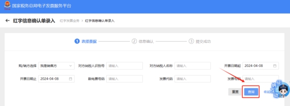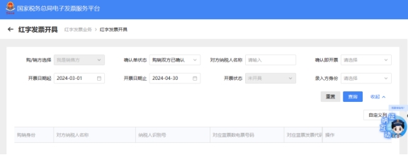 四、錄入查詢條件查詢到此前開具的紅字信息確認單,點擊右側(cè)的“去開票”,進入紅字發(fā)票開具頁面,之后正常開具紅字發(fā)票即可。